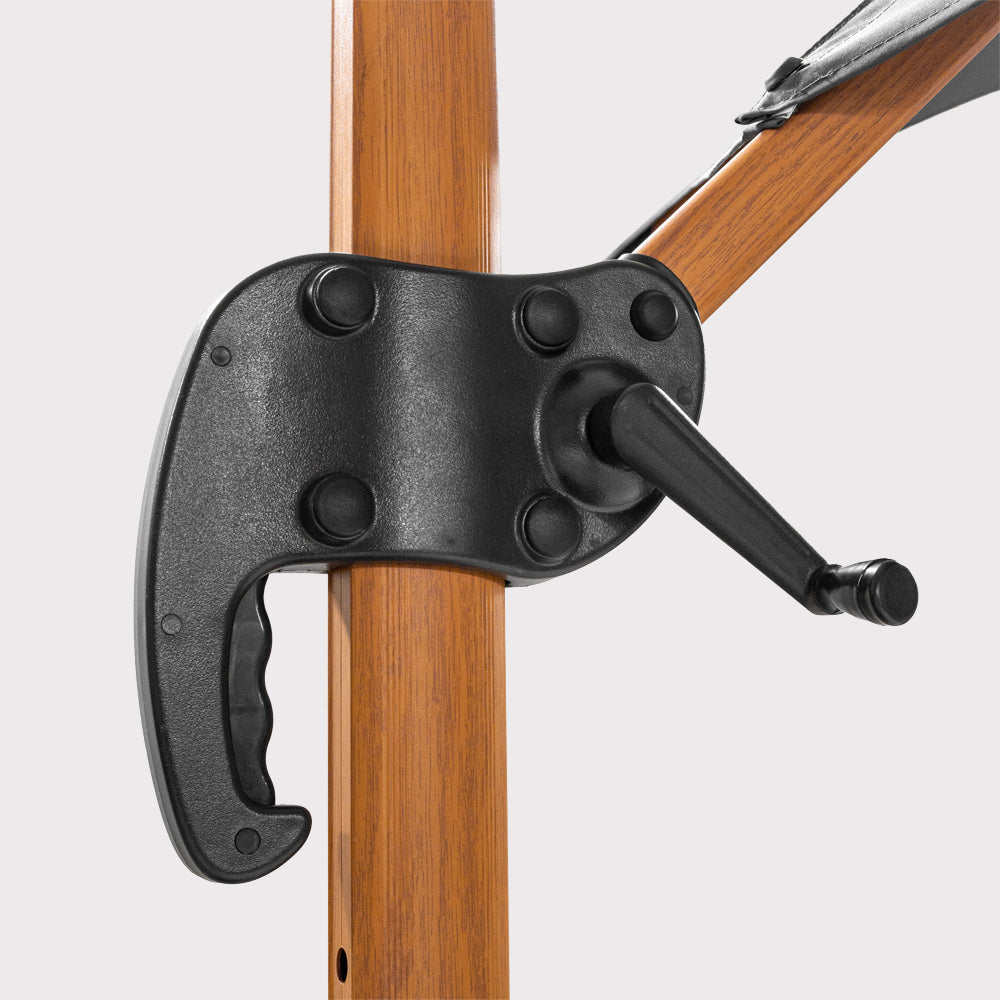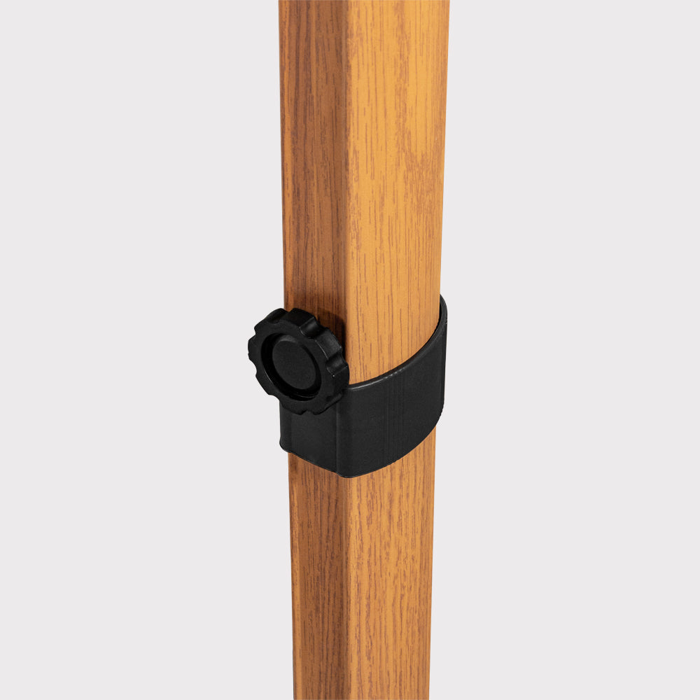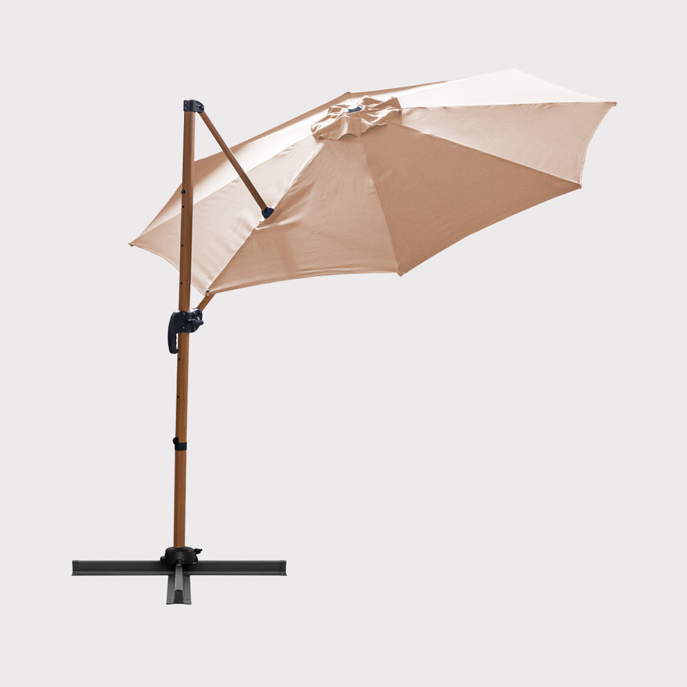 This beige garden umbrella with a spacious canopy effectively protects against strong sunlight, ensuring comfort while relaxing outdoors. Thanks to its adjustable mechanisms, its positioning can be easily adjusted to suit individual needs.