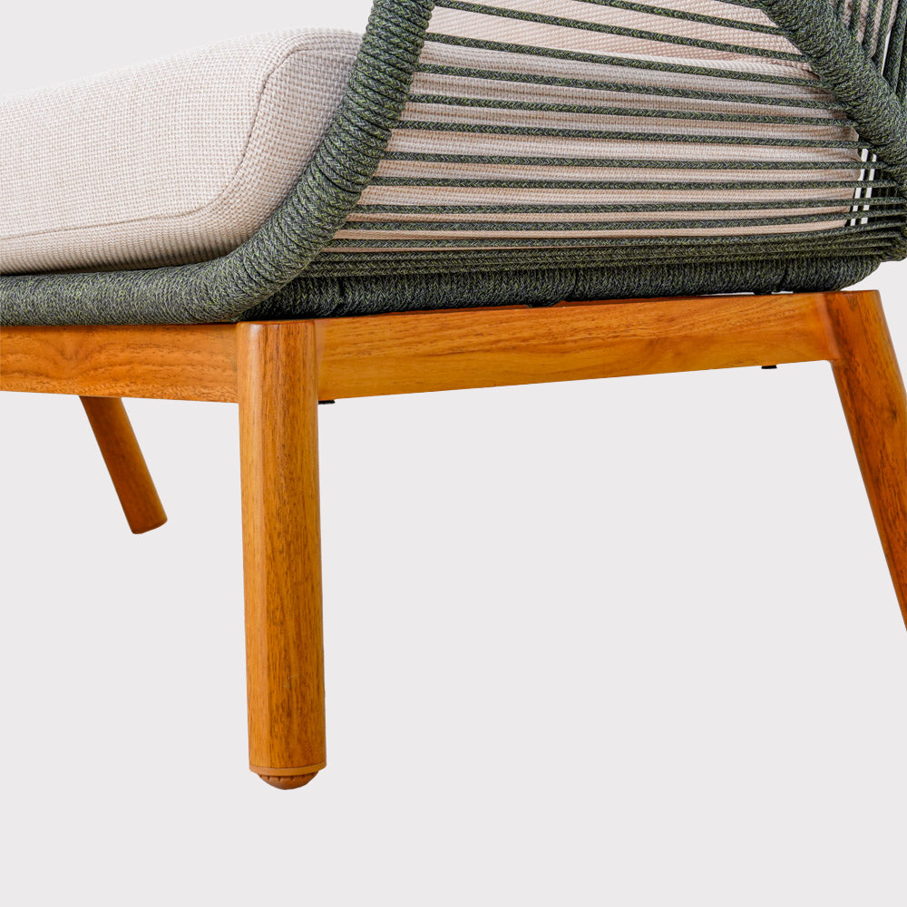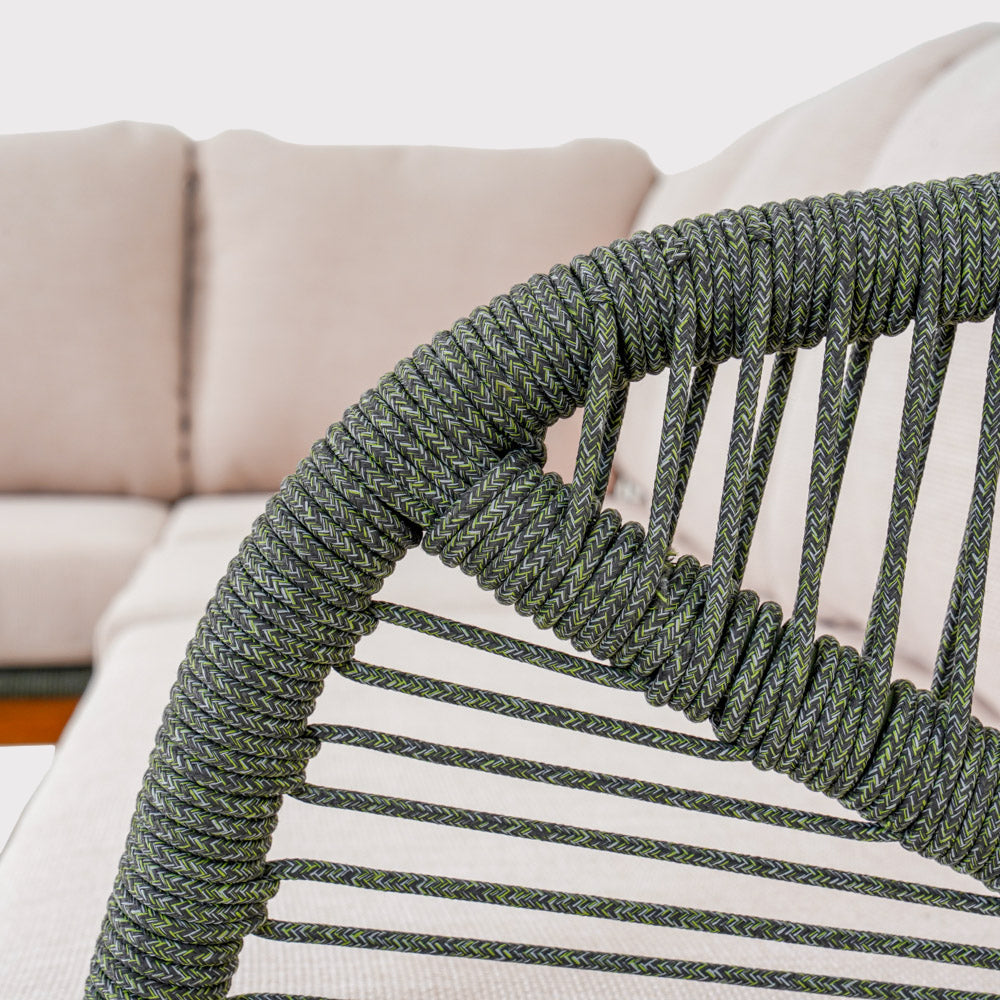 The Auro set consists of a spacious corner sofa, two armchairs, and an elegant coffee table with a ceramic top. The aluminum frame, finished with heat transfer technology, and the woven rope seats ensure durability and aesthetic appeal. The soft olefin cushions are moisture, stain, and wrinkle-resistant, ensuring comfort.