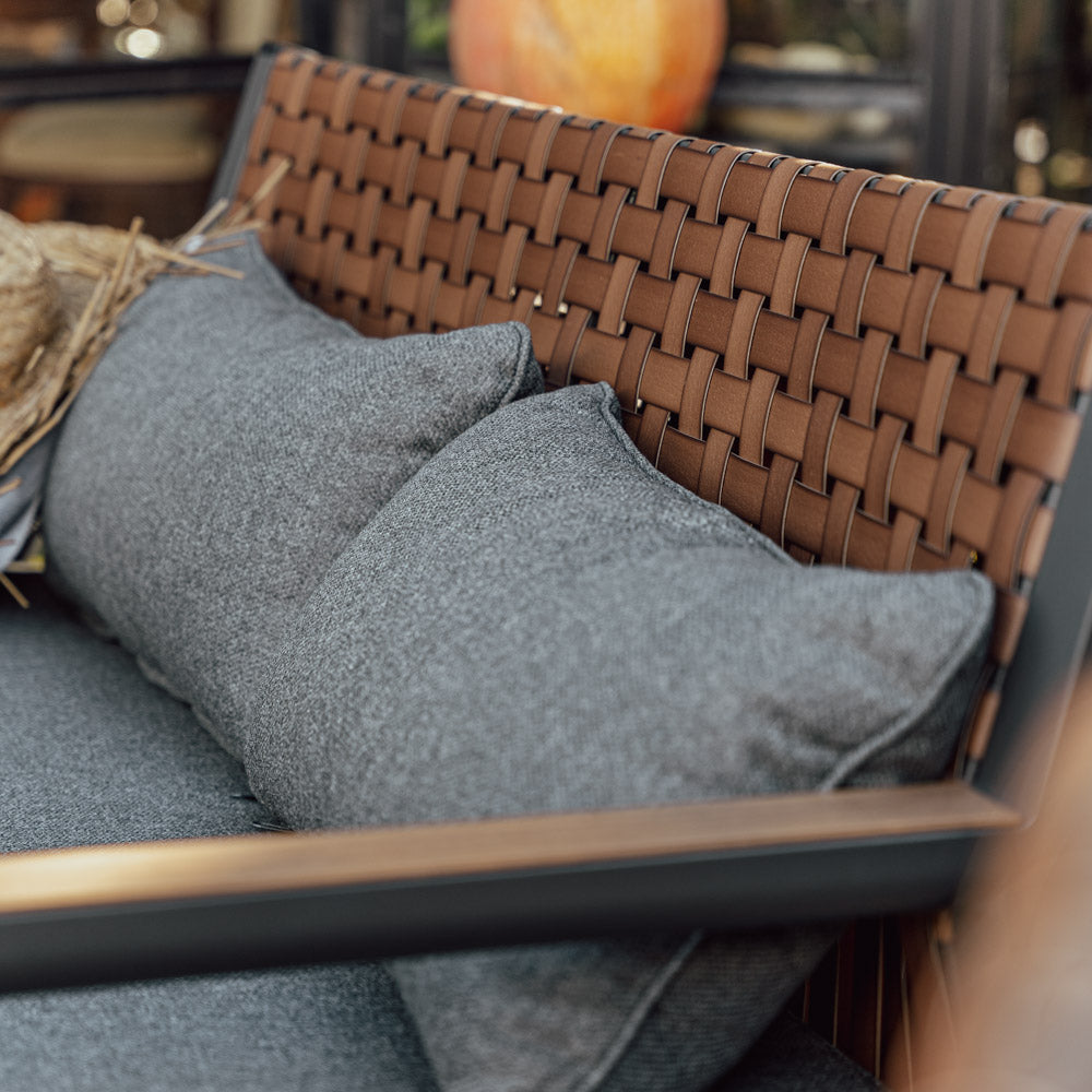 This modern country-style coffee table set boasts a natural character. Leather-like weaves combined with an aluminum frame create solid and beautiful furniture for discerning customers. Comfortable seats with cushions are perfect for everyday relaxation.