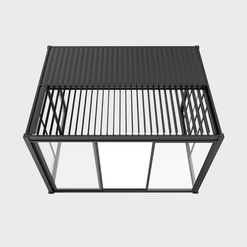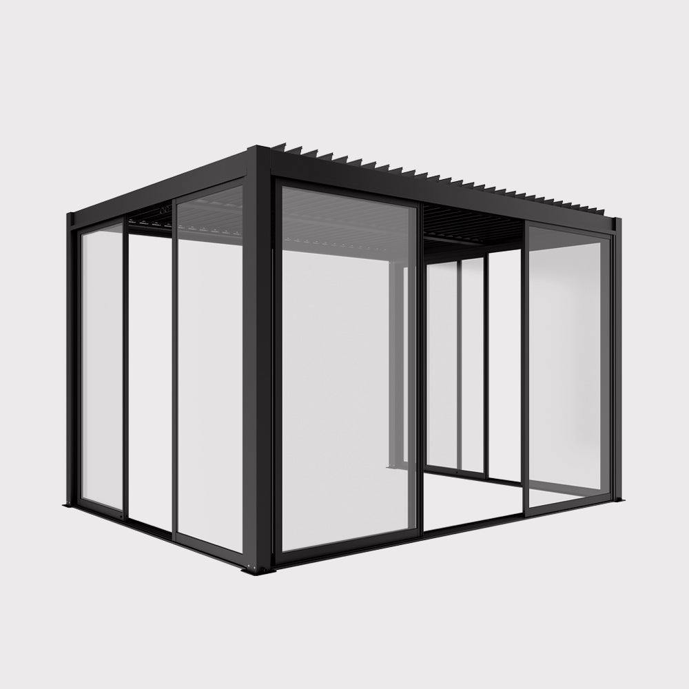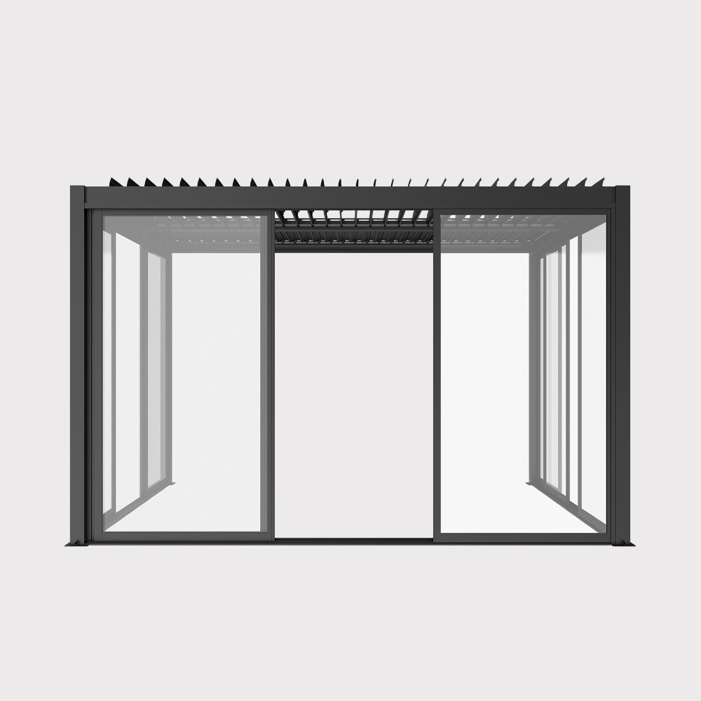 Drzwi przesuwne S8 LUXE w kolorze antracytowym to stylowe i praktyczne domknięcie pergoli LUXE o szerokości 3 metrów i wysokości 2,5 m. Zestaw trzech przesuwnych skrzydeł pozwala swobodnie regulować otwarcie przestrzeni – od pełnego odsłonięcia tarasu po jego osłonięcie przed wiatrem czy chłodniejszym powietrzem. Minimalistyczna forma i stonowany kolor doskonale wpisują się w nowoczesną architekturę ogrodową, tworząc spójną, elegancką całość z konstrukcją pergoli.