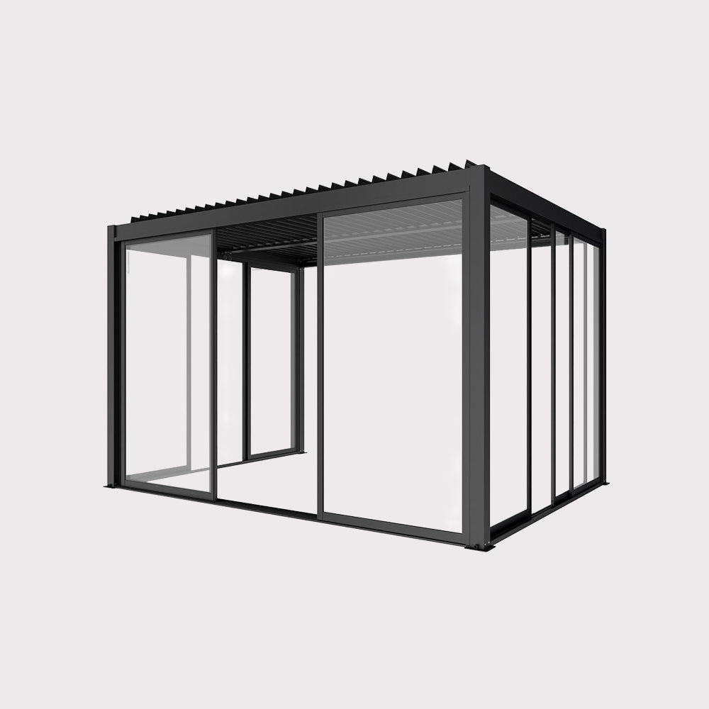 Drzwi przesuwne z aluminium i szkła hartowanego umożliwiają pełną zabudowę pergoli Luxe oraz elastyczne dopasowanie przestrzeni dzięki trzem skrzydłom na prowadnicach.