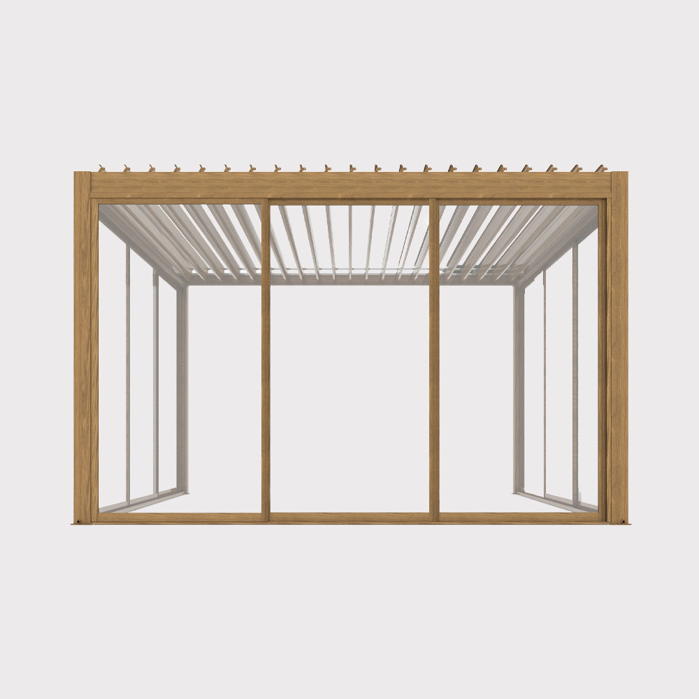 Rama w wykończeniu imitującym drewno łączy trwałość metalu z naturalnym charakterem, a szkło hartowane gwarantuje bezpieczeństwo i niezakłócony widok otoczenia. Całość tworzy solidną i funkcjonalną zabudowę, która podnosi komfort użytkowania pergoli.