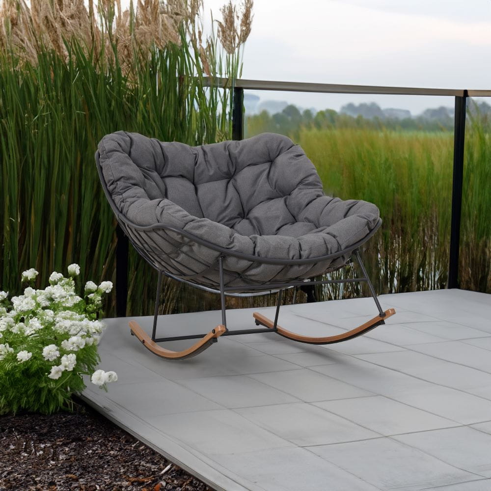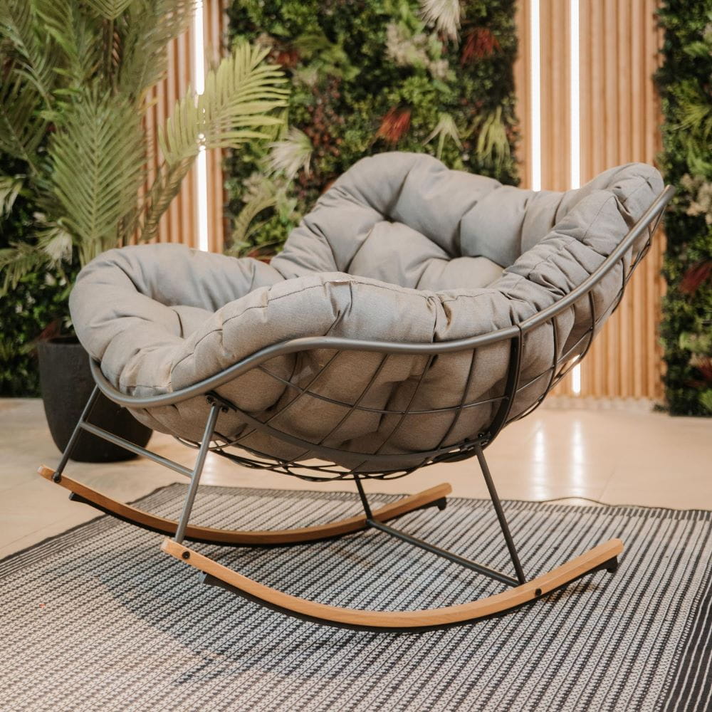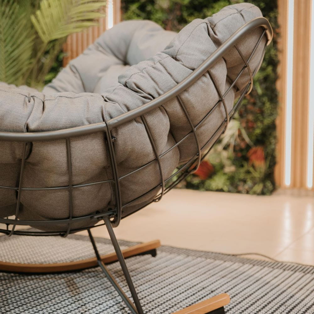 Bujane krzesło ogrodowe. Komfortowe, szerokie z grubymi poduszkami wykonanymi ze spun poliestru na oparciu i siedzisku. Rama wykonana ze stali malowanej proszkowo.