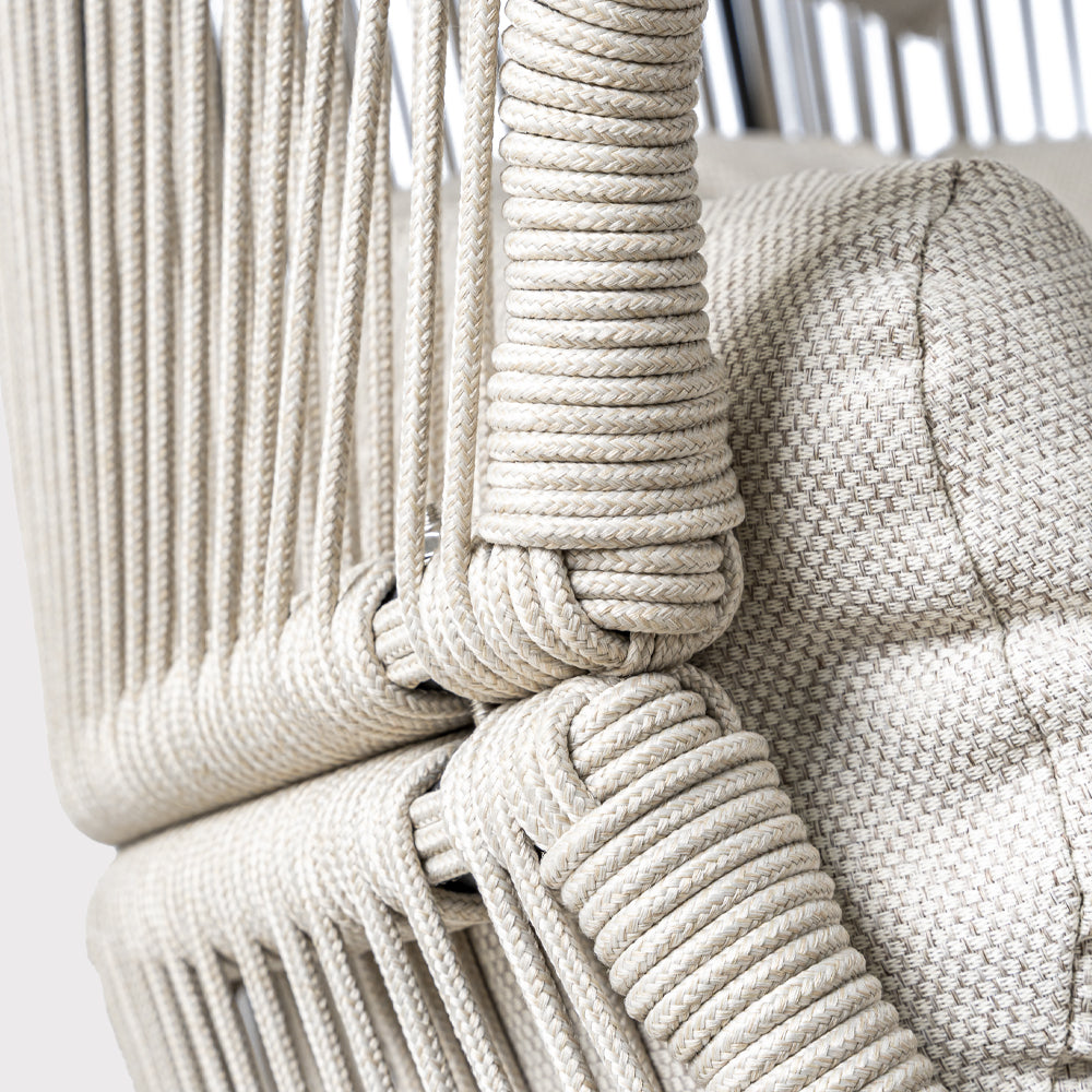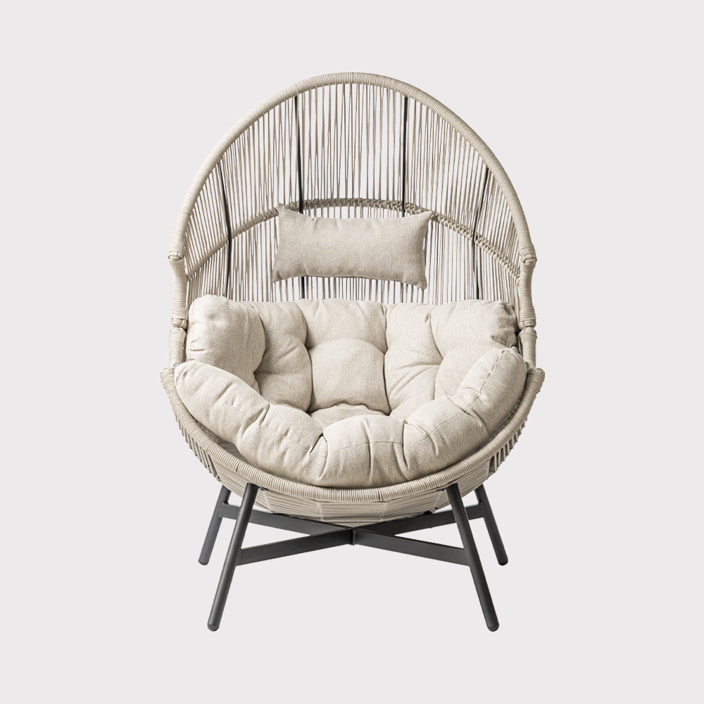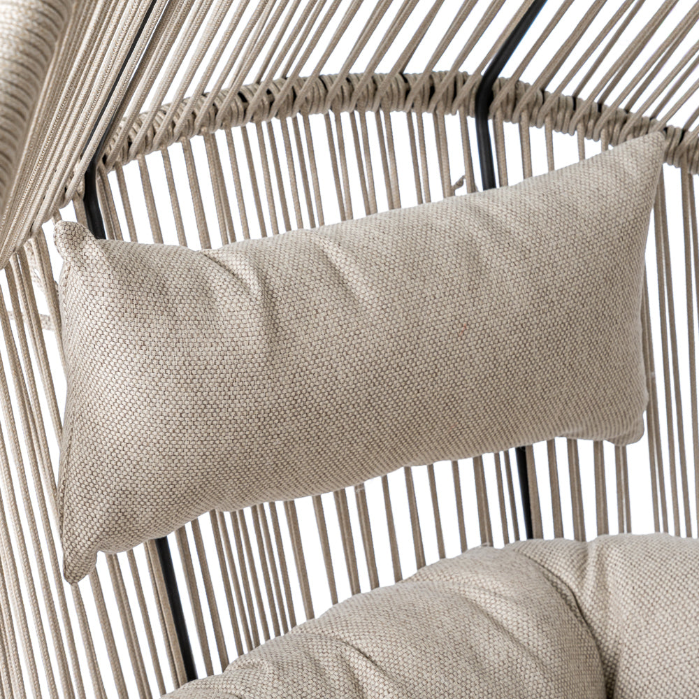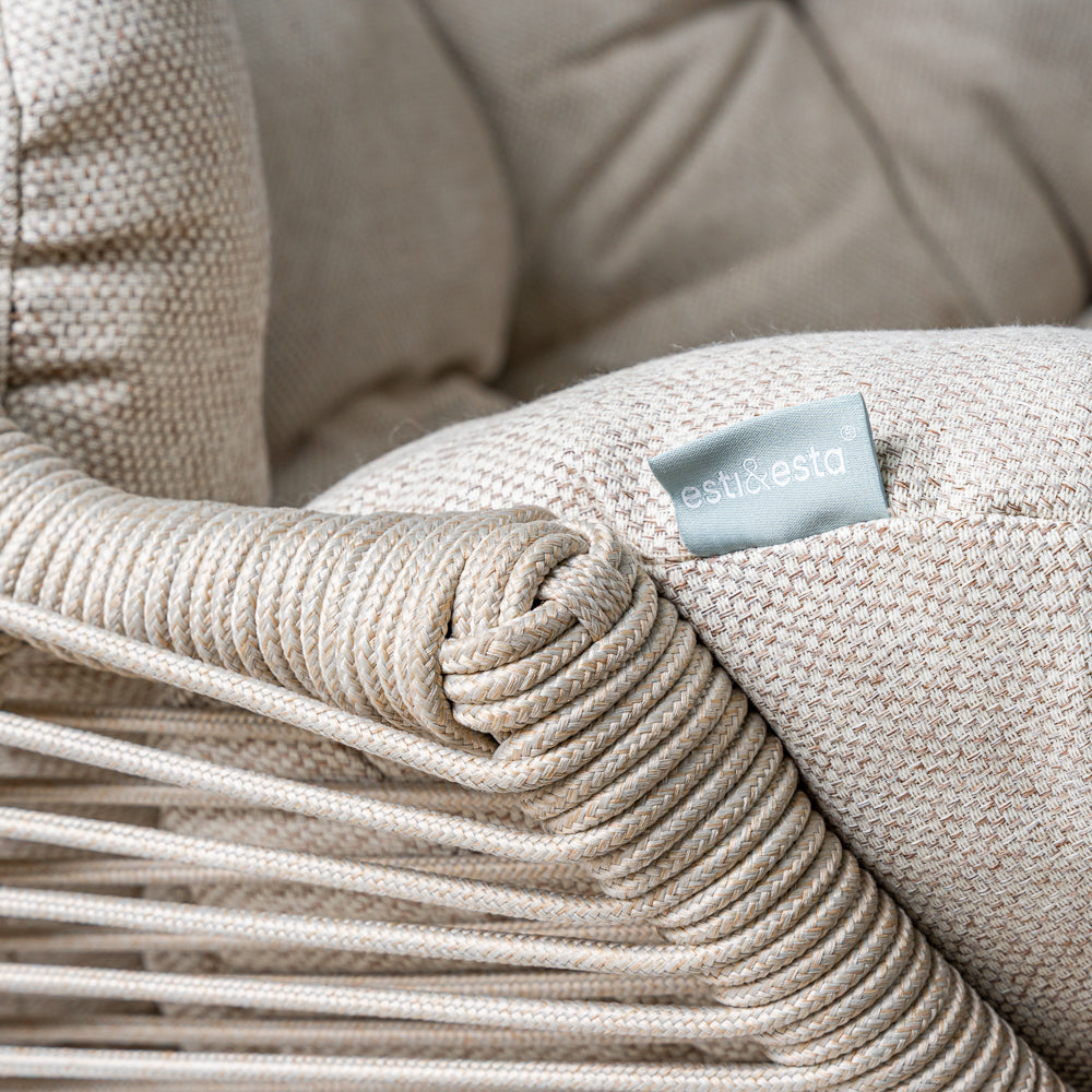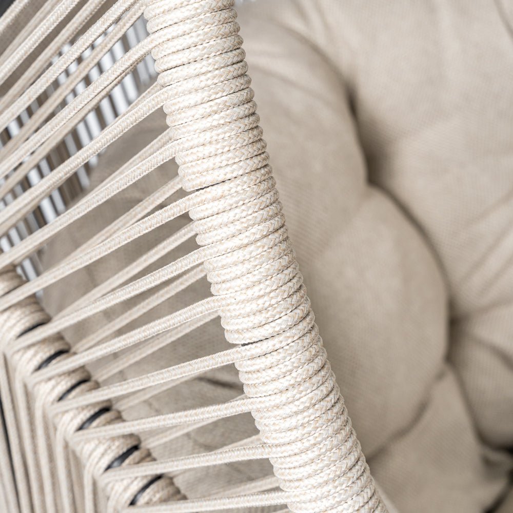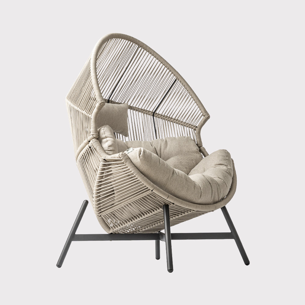 Fotel ogrodowy HOLA w beżowej wersji to połączenie nowoczesnej, ażurowej formy z wygodą codziennego użytkowania. Konstrukcja oparta na stalowej ramie malowanej proszkowo w czarnym kolorze zapewnia stabilność i trwałość, jednocześnie zachowując wizualną lekkość. Siedzisko wykonane z beżowego sznurka tworzy efekt subtelnej plecionki, która doskonale wpisuje się w estetykę współczesnych przestrzeni ogrodowych i tarasowych. Uzupełnieniem całości są miękkie poduszki z tkaniny spun-poliester w dopasowanym, beżowym odcieniu, które zwiększają komfort siedzenia i sprzyjają dłuższemu wypoczynkowi. Proporcje fotela pozwalają na wygodne użytkowanie zarówno w ogrodzie, na tarasie, jak i w zadaszonych strefach relaksu czy nowoczesnych ogrodach zimowych. Model HOLA sprawdzi się jako pojedynczy akcent aranżacyjny lub element większego zestawu wypoczynkowego, wprowadzając do przestrzeni spokojny, elegancki charakter i przyjemną atmosferę relaksu.
