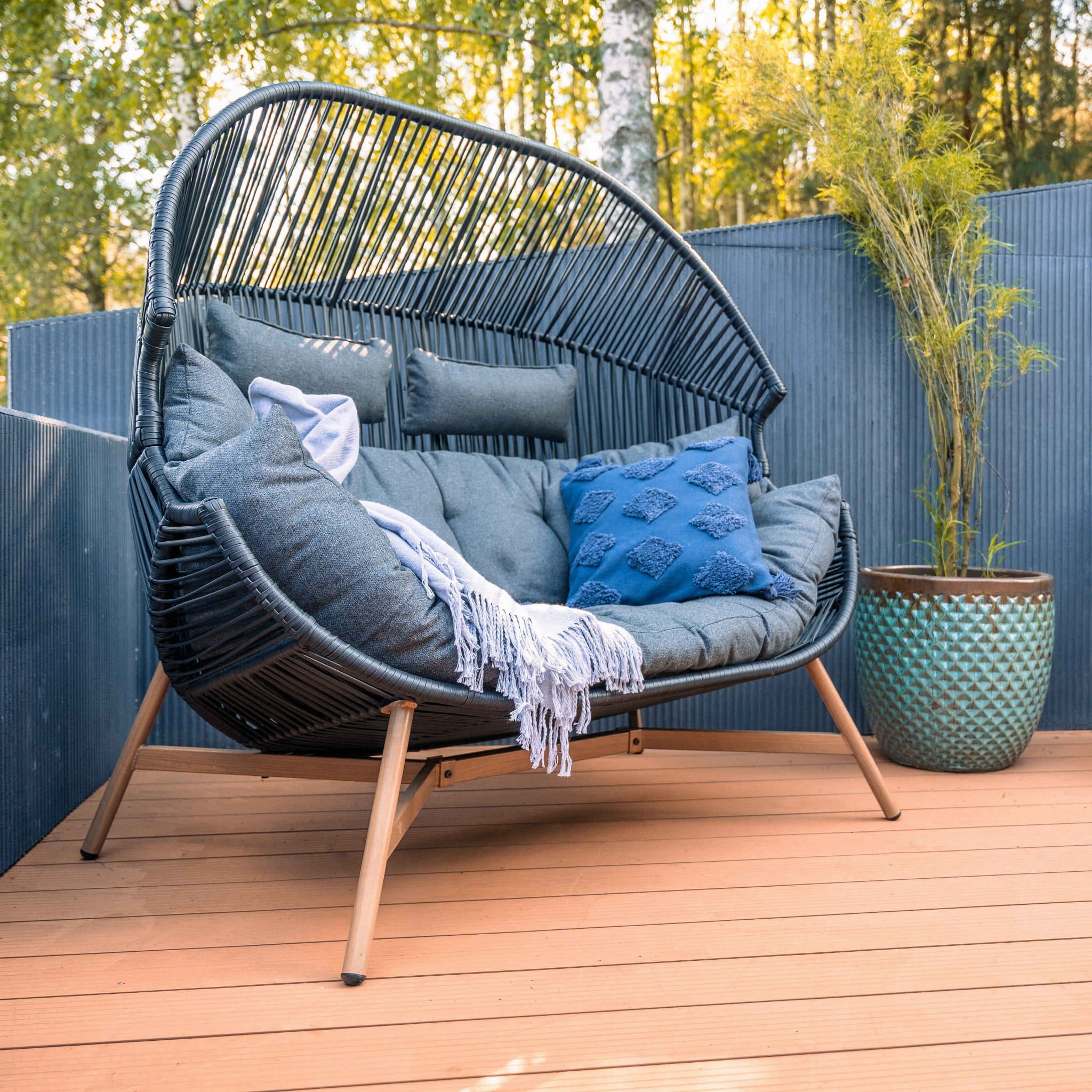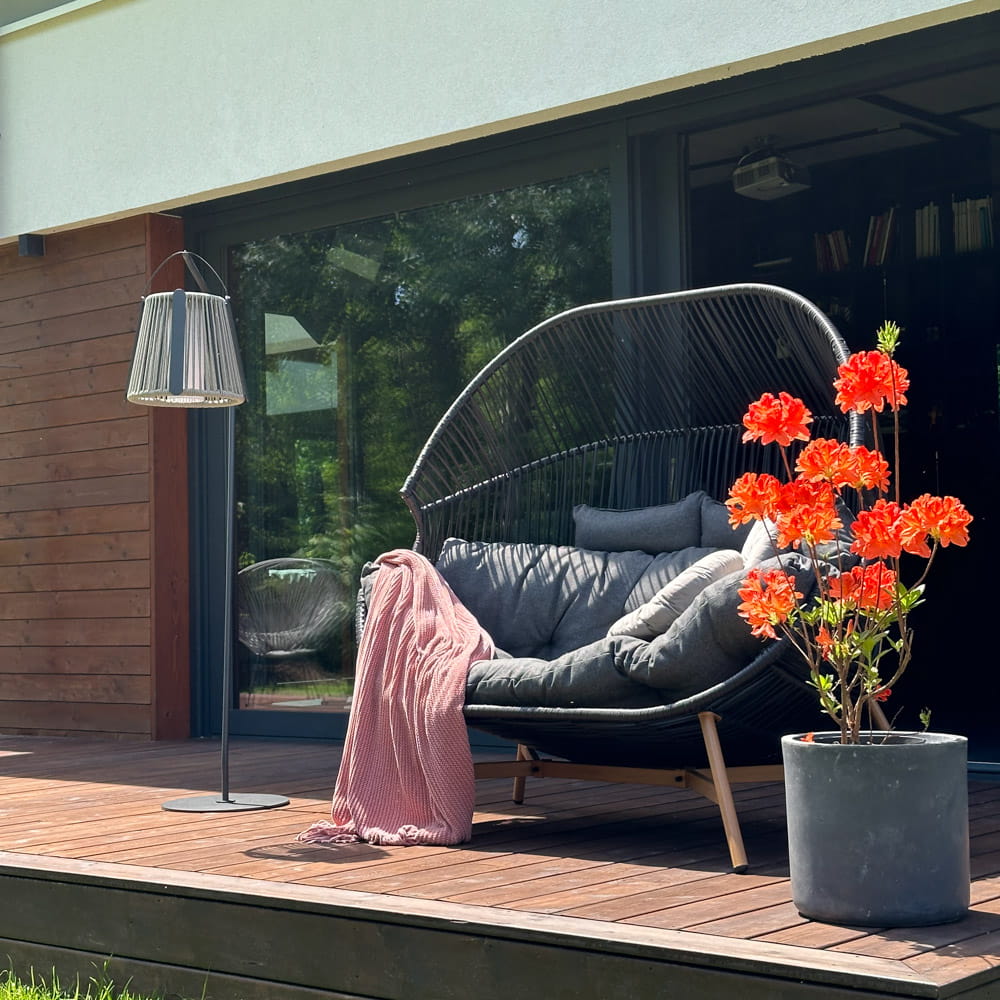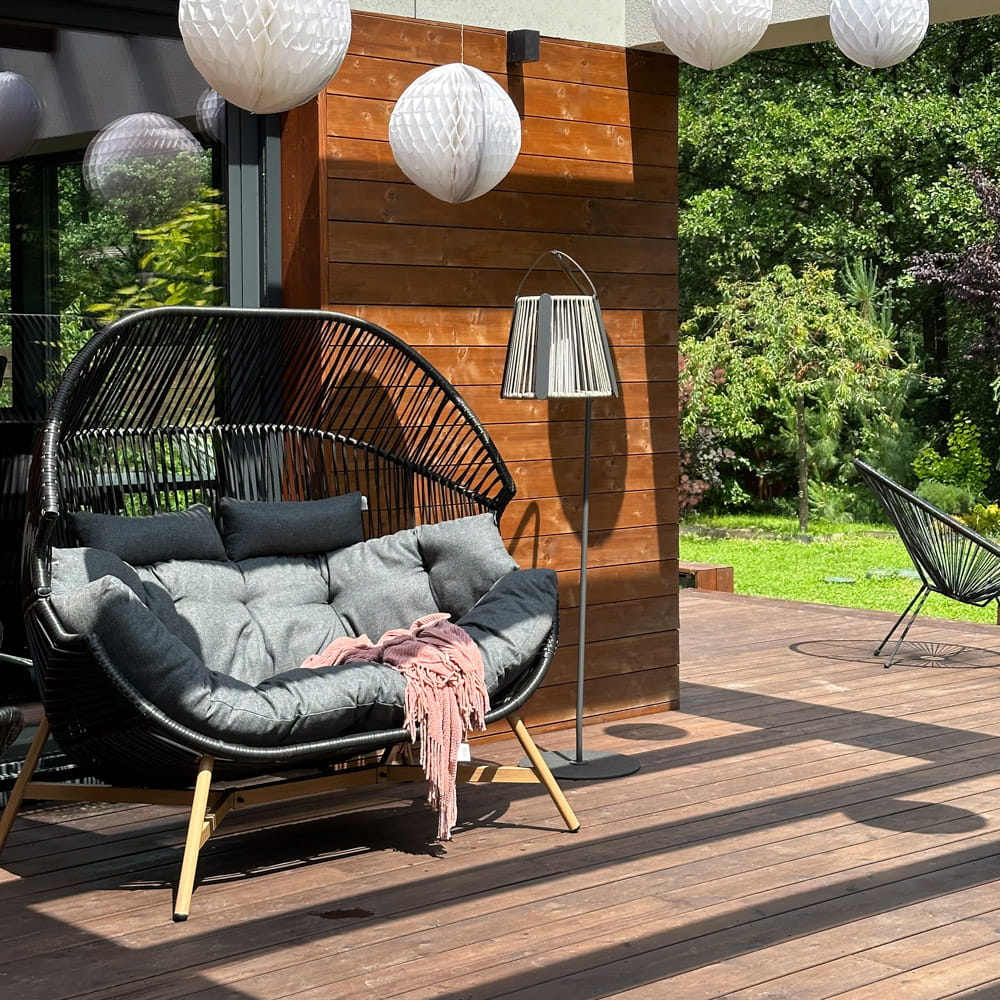 Fotel ogrodowy Holand w wersji dwuosobowej to połączenie nowoczesnego designu i pełnego komfortu. Obszerny, wyprofilowany kosz z charakterystycznym splotem pozwala swobodnie zrelaksować się w dowolnej pozycji – samodzielnie lub we dwoje. Miękka poduszka na siedzisko oraz dwie dodatkowe poduszki na oparcie wykonane ze spun poliestru zapewniają wygodę i są łatwe w utrzymaniu. Stabilna stalowa rama gwarantuje wytrzymałość, a beżowa kolorystyka i stylowy splot sprawiają, że fotel doskonale wpisuje się w najnowsze trendy aranżacyjne. To wyjątkowe miejsce wypoczynku, które podkreśli charakter tarasu, ogrodu czy nowoczesnych wnętrz.