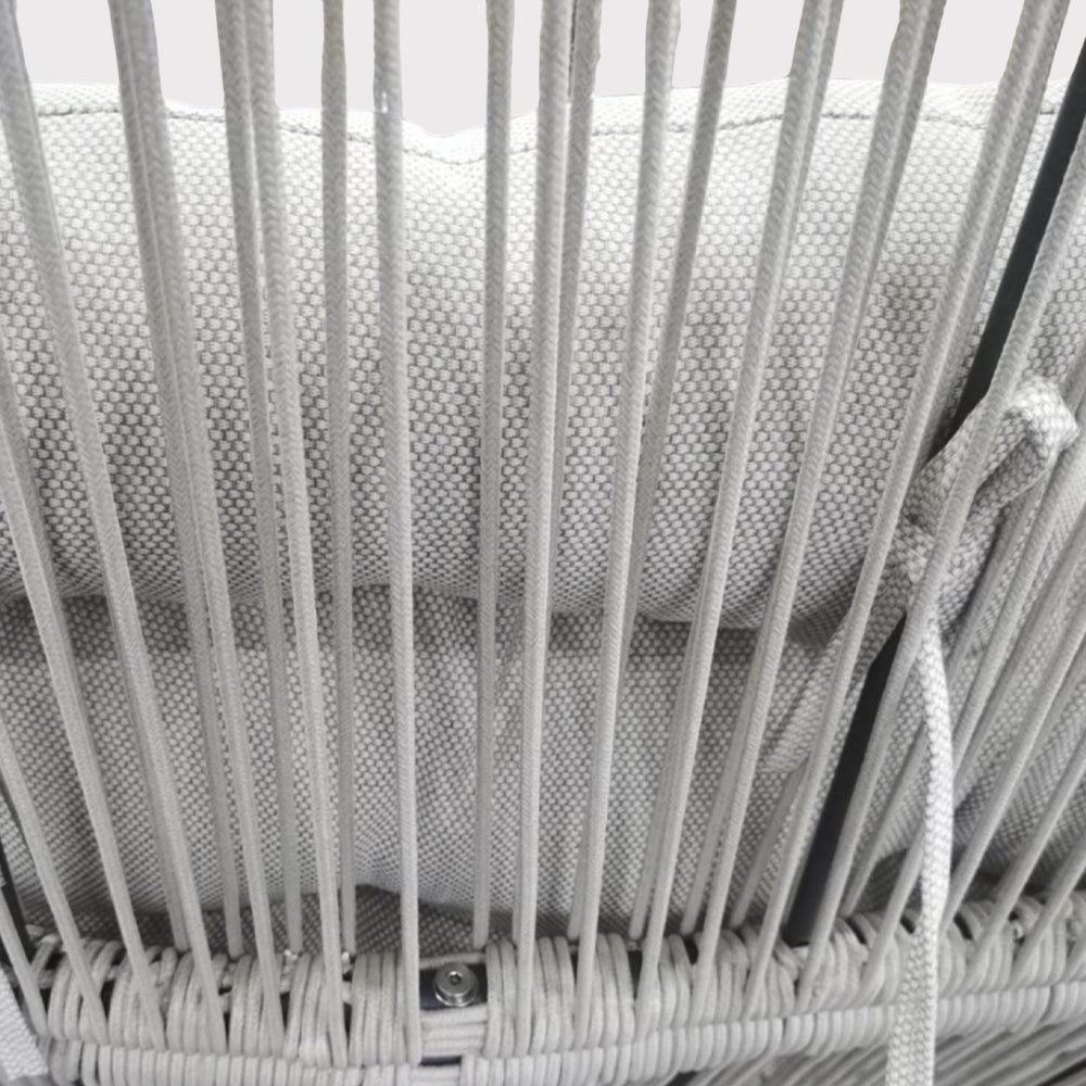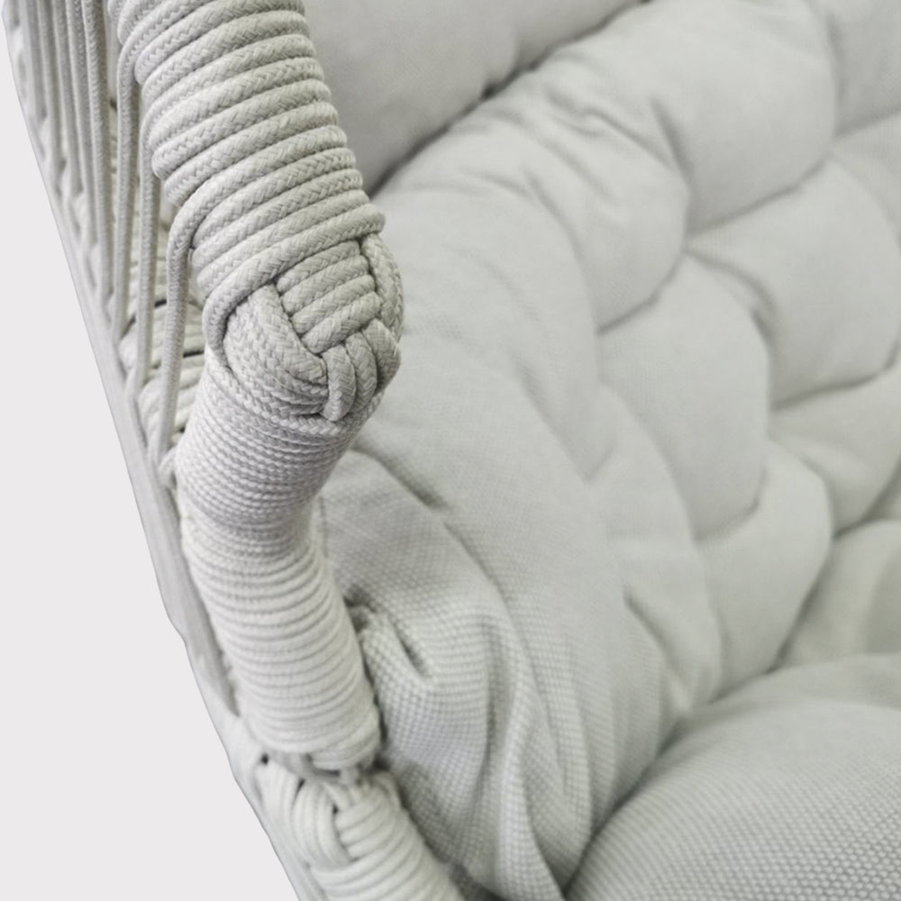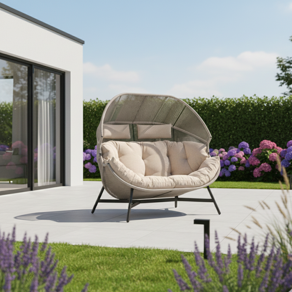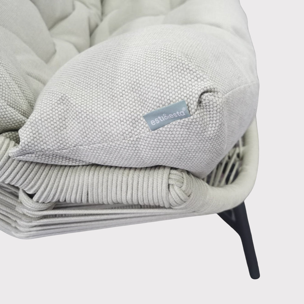 Fotel podwójny HOLA to propozycja stworzona z myślą o relaksie w duecie – w ogrodzie, na tarasie lub w zadaszonej strefie wypoczynkowej. Konstrukcja opiera się na stalowej ramie malowanej proszkowo na kolor czarny, która zapewnia stabilność oraz odporność na codzienne użytkowanie. Siedzisko wykonane z beżowego, sznurkowego wyplotu nadaje meblowi lekki, nowoczesny charakter i dobrze komponuje się z naturalnymi aranżacjami ogrodowymi. Model HOLA został zaprojektowany jako przestronny fotel dla dwóch osób, oferujący wygodę zarówno podczas krótkiego odpoczynku, jak i dłuższego relaksu. W zestawie znajdują się beżowe poduszki ze spun-poliestru, które zwiększają komfort siedzenia i podkreślają przytulny charakter mebla. Harmonijne połączenie czarnej ramy z jasnym siedziskiem i poduszkami sprawia, że fotel HOLA dobrze odnajduje się zarówno w nowoczesnych, jak i bardziej klasycznych przestrzeniach zewnętrznych.