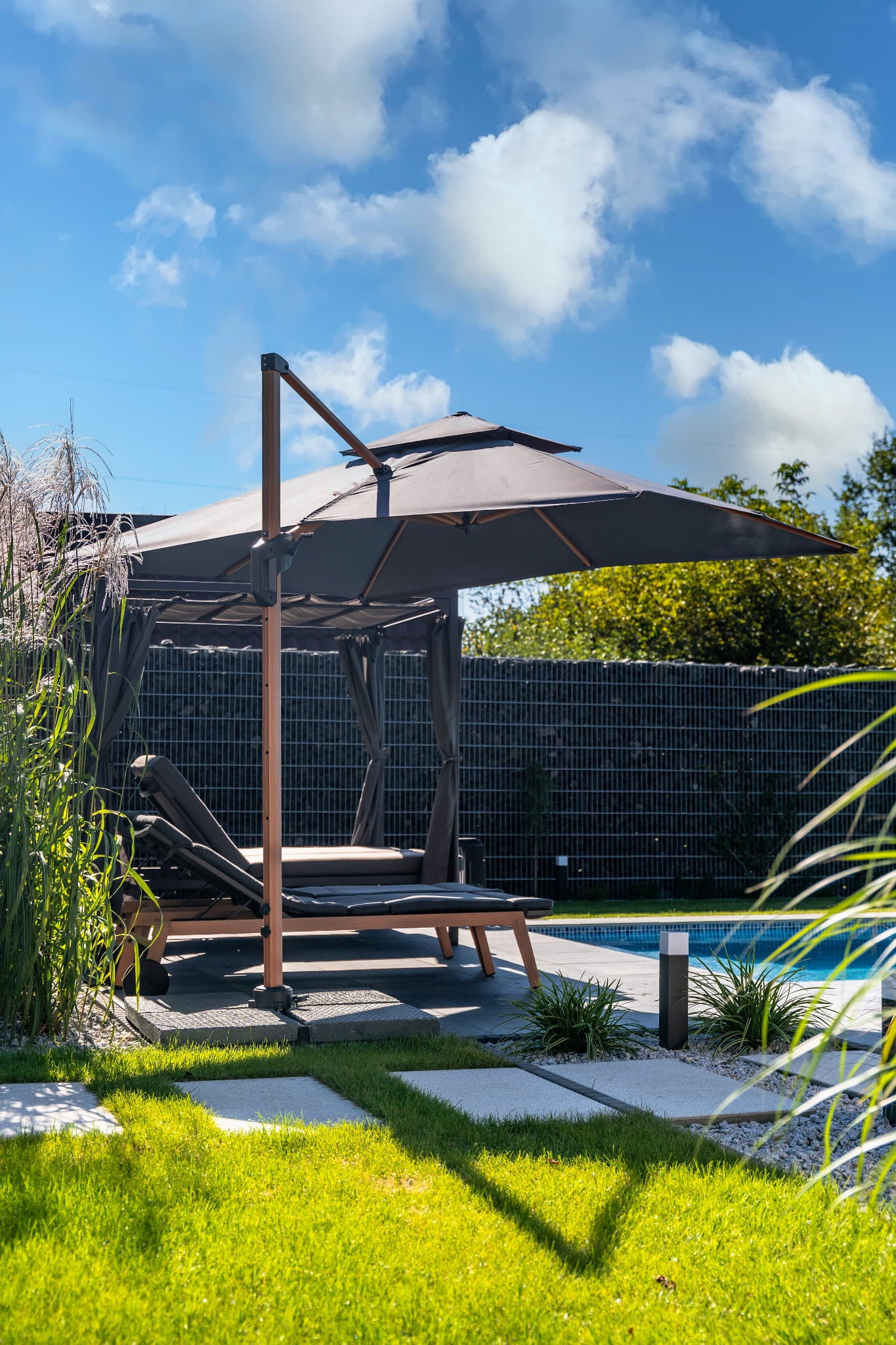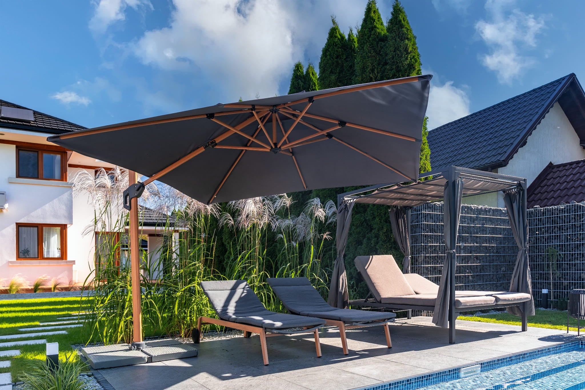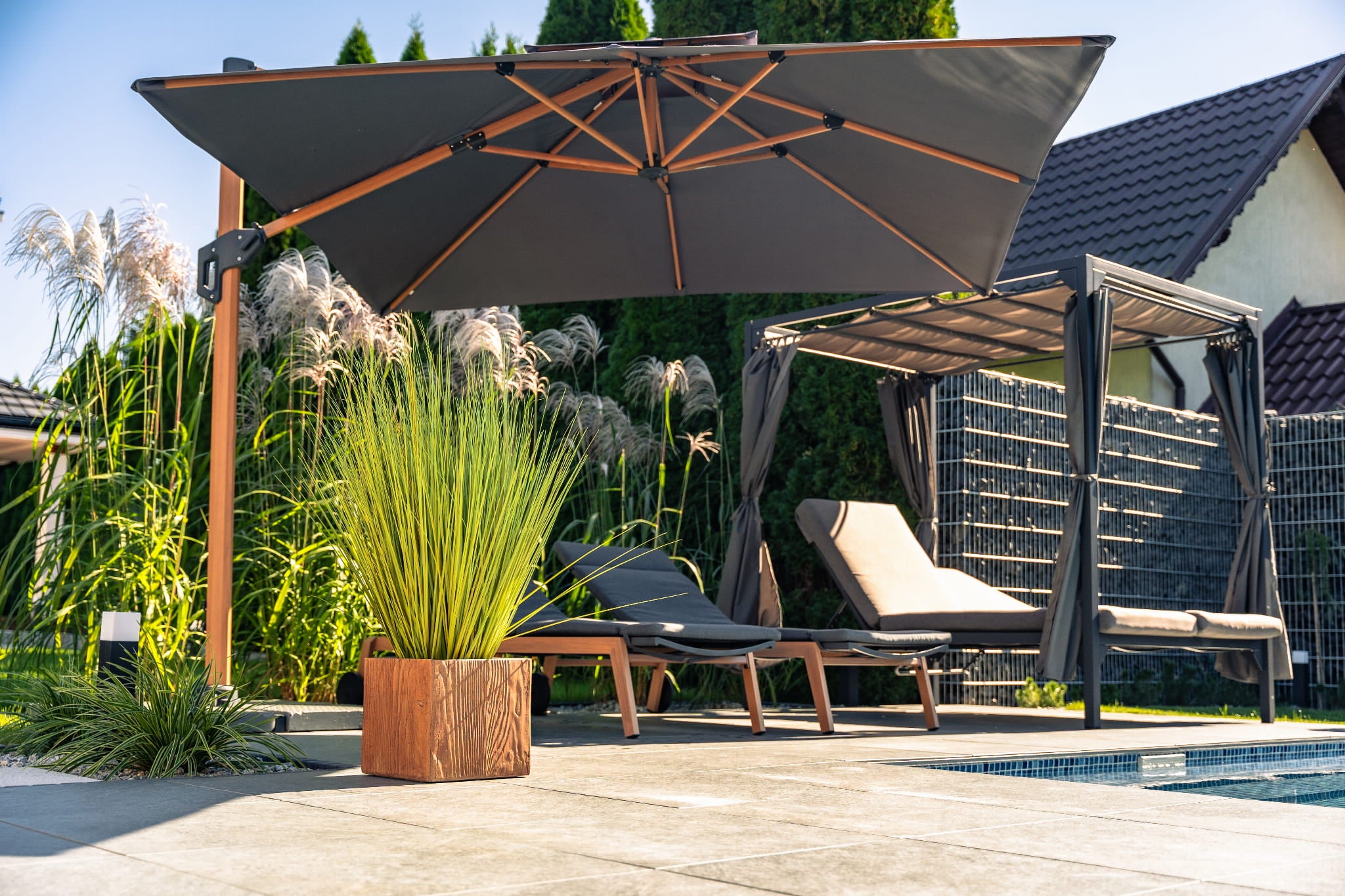 Duży parasol ogrodowy z kwadratową czaszą i aluminiowym słupkiem to solidna konstrukcja, która niezawodnie sprawdza się w ogrodzie. Zaletą parasola jest możliwość regulacji na wielu płaszczyznach, co umożliwia dopasowanie go do indywidualnych potrzeb użytkowników.